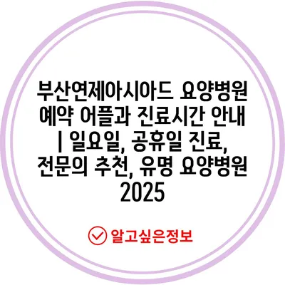 부산연제아시아드 요양병원 예약 어플과 진료시간 공지 | 일요일, 공휴일 진료, 전연락 추천, 유명 요양병원 2025 에 대해 자주 묻는 질문 TOP 5